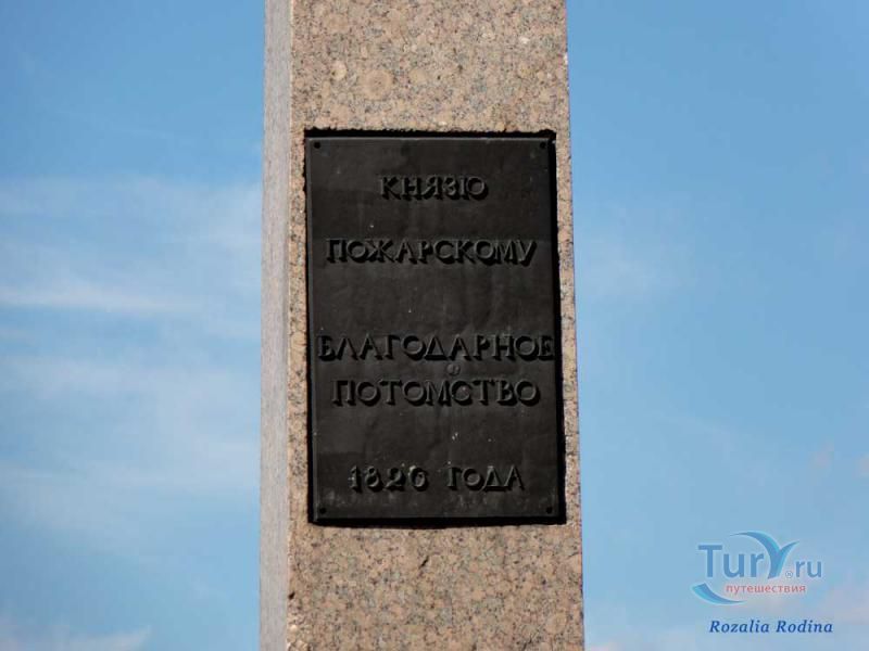 Памятник-обелиск князю Пожарскому находится в кремле Нижнего Новгорода, неподалёку от Михайло-Архангельского собора. Обелиск посвящён руководителям 2-го земского ополчения Кузьме Минину и Дмитрию Пожарскому. С двух сторон к обелиску прикреплены две бронзовые доски с барельефными изображениями Минина и Пожарского и мифологическими гениями держащими над их головами лавровые венки. Над барельефами размещены чугунные плиты с текстом: "Гражданину Минину - благодарное потомство. 1826 год", "Князю Пожарскому - благодарное потомство. 1826 год". Открытие обелиска состоялось 28 августа 1828 года. Торжественная церемония состояла из освящения обелиска и парада гарнизона Нижегородского кремля.