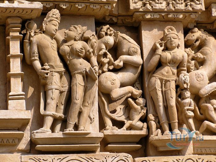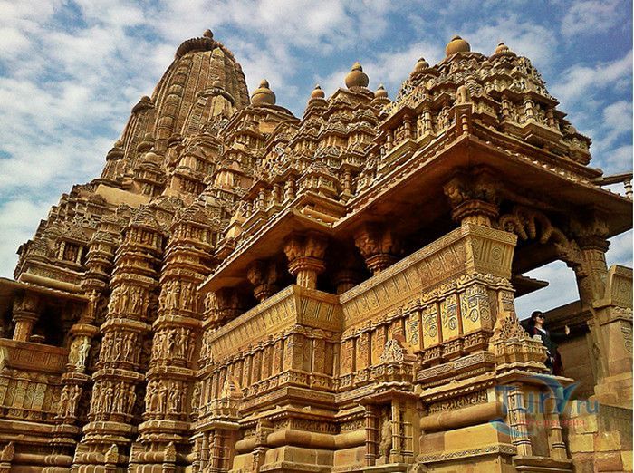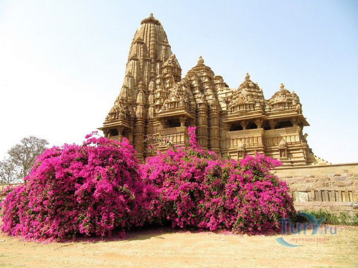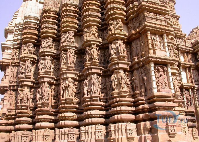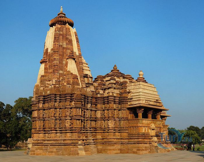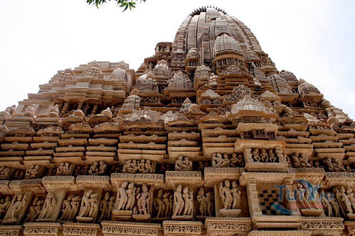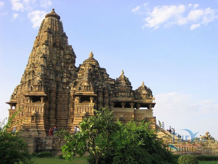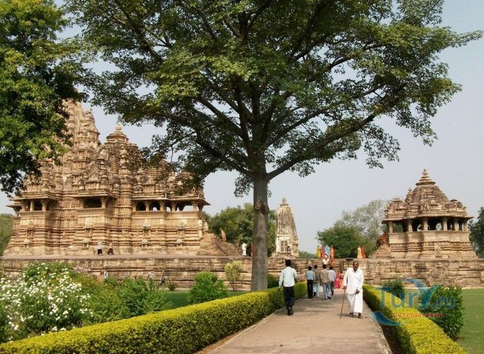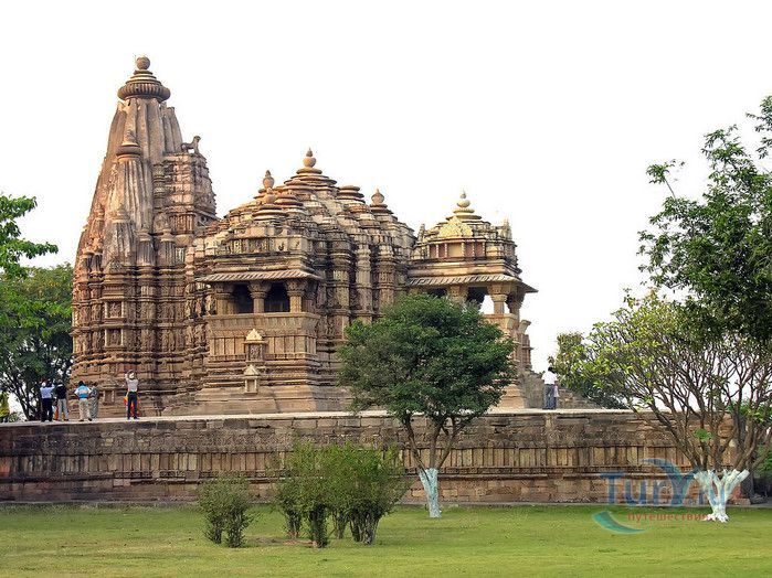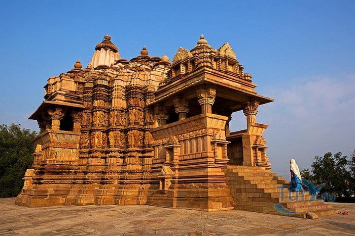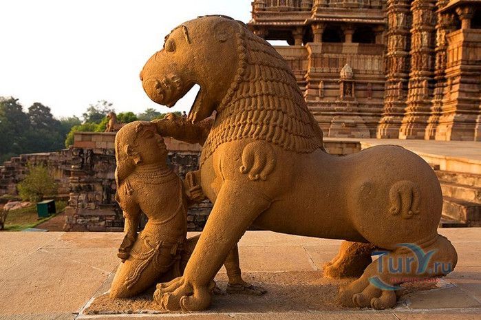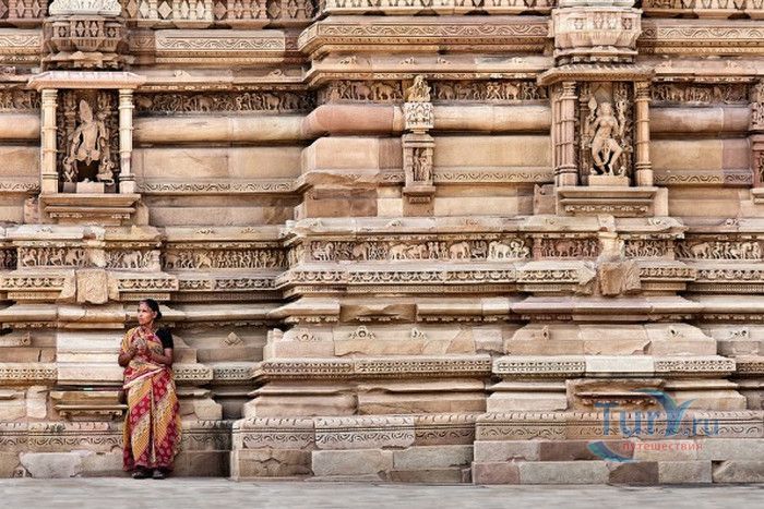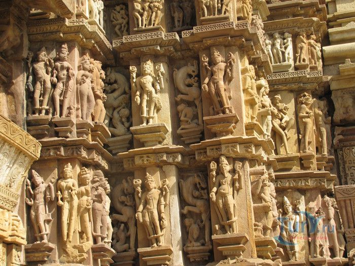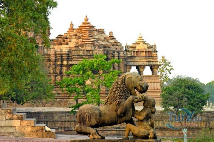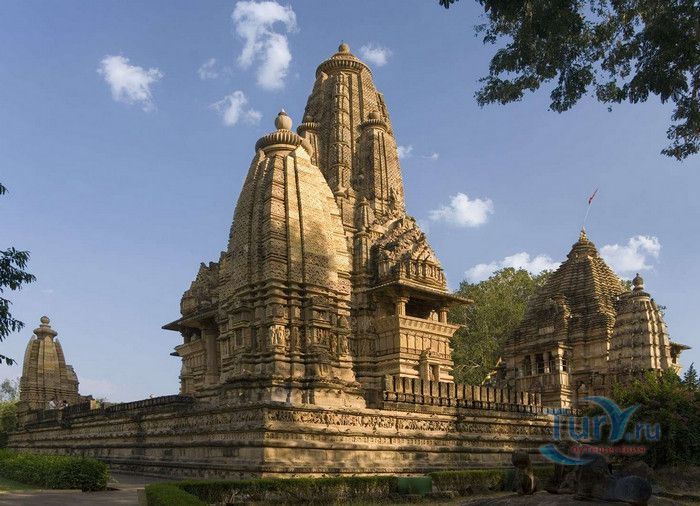 Группа храмов в Кхаджурахо, объект Всемирного наследия ЮНЕСКО, - великолепный образец искусства и храмовой архитектуры средневековой Индии. Комплекс храмов расположен в индийском штате Мадхья-Прадеш, в небольшом городке Кхаджурахо. Храмы были построены в 950 - 1050 годах, во время правления в Центральной Индии могущественной династии Чандела. Кхаджурахо считался культурной и религиозной столицей государства, в течение 100 лет в городе были возведены 85 храмов, до наших дней сохранились лишь 22. После заката династии Чандела в XIII веке Кхаджурахо словно исчез с лица земли, а величественный храмовый комплекс поглотили джунгли. Лишь в 1838 году Кхаджурахо был вновь открыт британским военным инженером Бертом, исследовавшим эту местность. Храмы Кхаджурахо построены рядом друг с другом, но представляют две различные религии - брахманизм (ранняя форма индуизма) и джайнизм, символизируя традицию принятия и уважения различных религиозных взглядов среди индусов и джайнов. Комплекс делится на три зоны - западную, восточную и южную. Наиболее представительная и хорошо сохранившаяся - западная группа (храмы Лакшмана, Варахи, Лакшми, Кандария-Махадевы, Джагадамби, Читрагупта (бога Солнца), Висванатха и святилище Нанди). Ближе к озеру расположена восточная группа (индуистские храмы Брахмы, Ваманы и Джавари и три джайнистских храма Гхантай, Адинатха и Паршванатха). Южная группа состоит из двух храмов - Дуладео и Чатурбхуджа. Храмы выполнены из гранита и песчаника, при строительстве не использовались какие-либо растворы, блоки укладывались один на другой и соединялись при помощи пазов и выступов. Каждый храм стоит на высокой каменной платформе-террасе и ориентирован по сторонам света. По периметру платформы и над центральным святилищем высятся высокие пирамидальные башни-шикхары. Их "нагромождение" создаёт иллюзию горной гряды Западного Тибета и священной горы Кайлас - обители Шивы и других богов. Шикхары и стены храмов украшены множеством барельефов и скульптур, изображающих сцены повседневной жизни, войны, ритуальные процессии и эротические сцены. Несмотря на то, что храмы Кхаджурахо получили мировую известность благодаря изображениям сцен плотской любви, на самом деле их доля не превышает 10% всех рельефов. Каджурахо можно назвать своеобразной каменной энциклопедий средневекового индийского общества и учения Тантры. В знаменитом романе Ивана Ефремова "Лезвие бритвы" описанию храмов посвящено немало восторженных слов: "Необъяснимое волнение охватило художника при виде высоких сикхар - башен над святилищами, собравшихся группами на фоне голубых столообразных гор в запыленном мареве горячего воздуха, плававшего над серой равниной" и "Можно показать женщину совершенно обнаженной и в то же время кристально чистой и благородно прекрасной. Можно изобразить страсть так, что в ней не будет ничего аморального, да посмотрите вы как следует на те же скульптуры Кхаджурахо".
