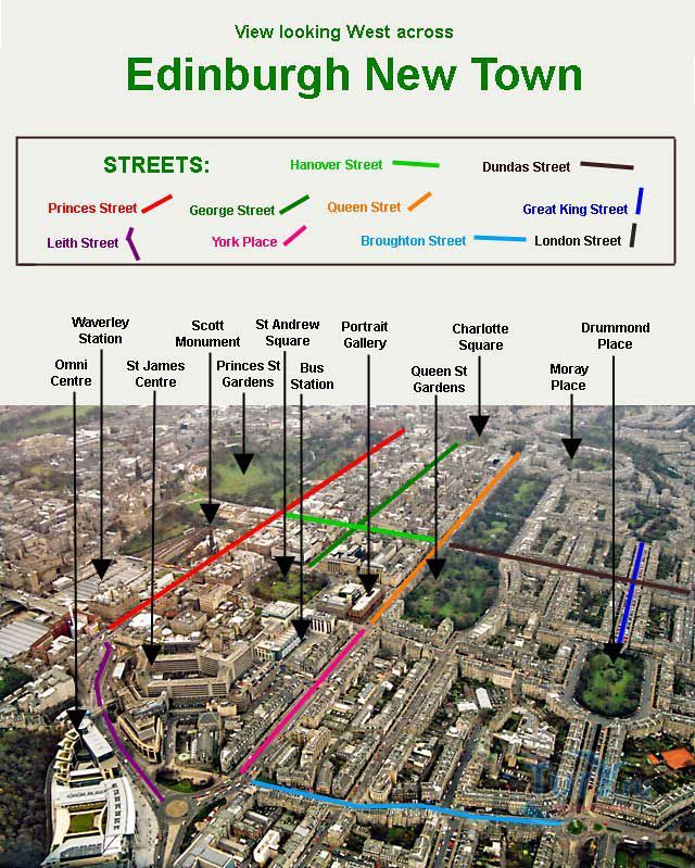 Центральной улицей нового квартала стала Джордж стрит, названная в честь правящего в то время короля Георга III. Северней Джордж стрит находится Куин стрит, улица южнее Джордж стрит была первоначально названа Сент-Джайлс стрит (St. Giles Street) в честь покровителя города Святого Эгидия. Площади Св. Андрея и Св. Георгия - покровителей Шотландии и Англии - символизировали союз Англии и Шотландии. Довершают картину улица Чертополоха и улица Розы - символы Шотландии и Англии.