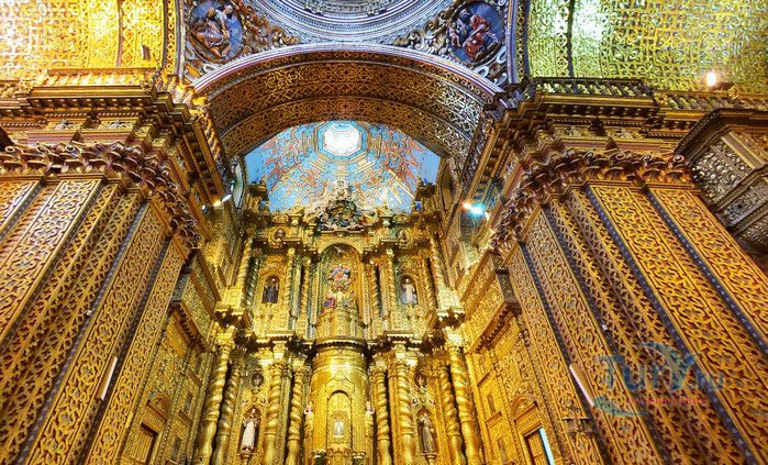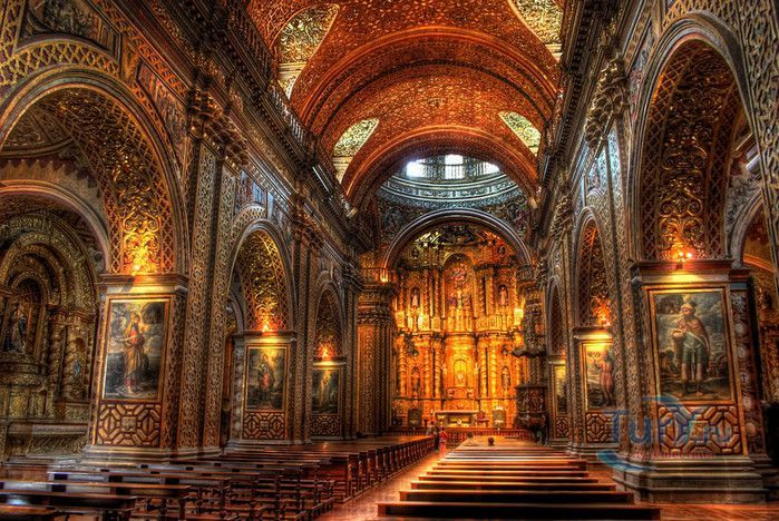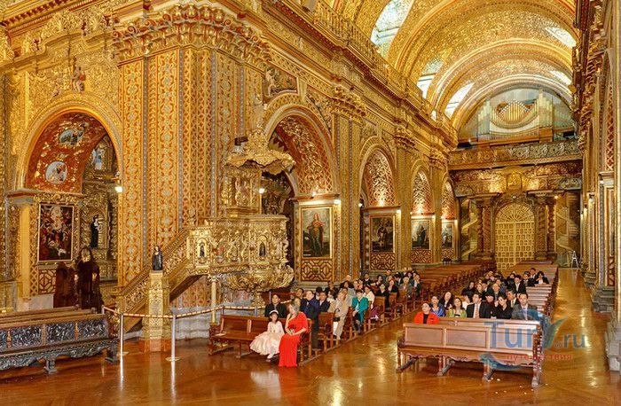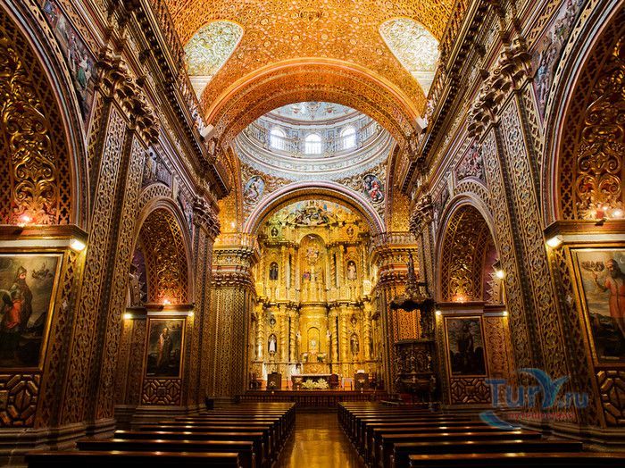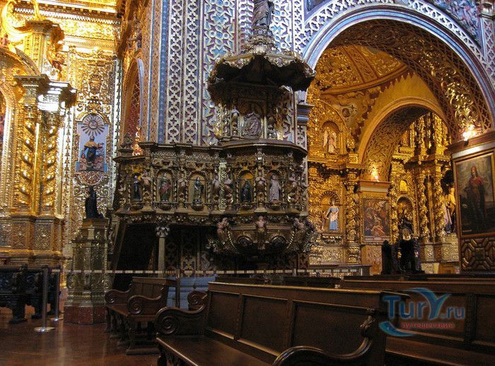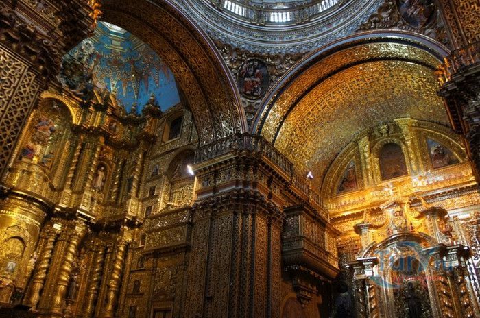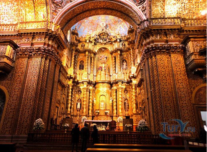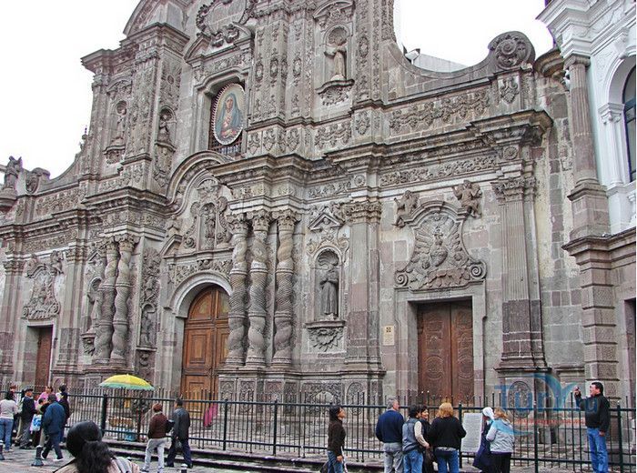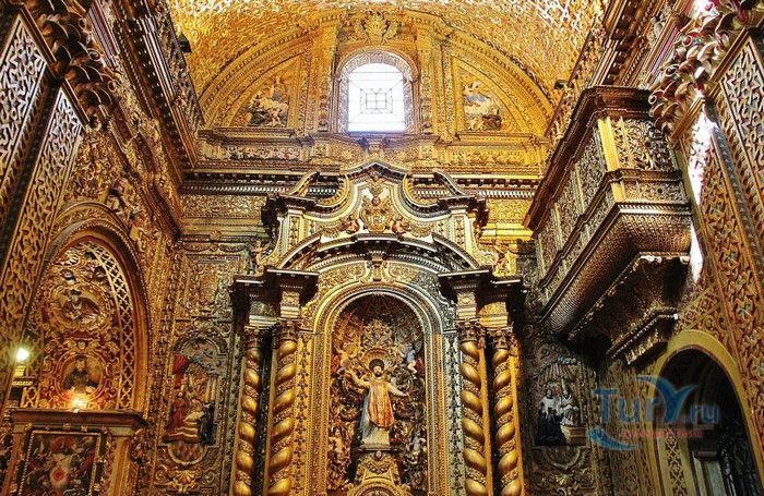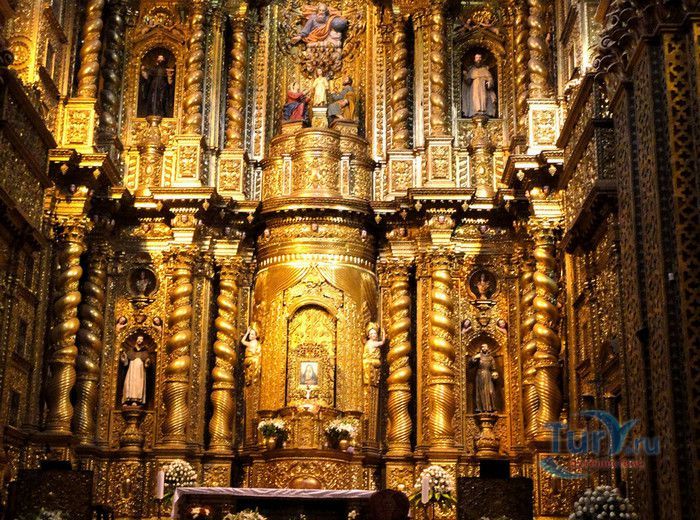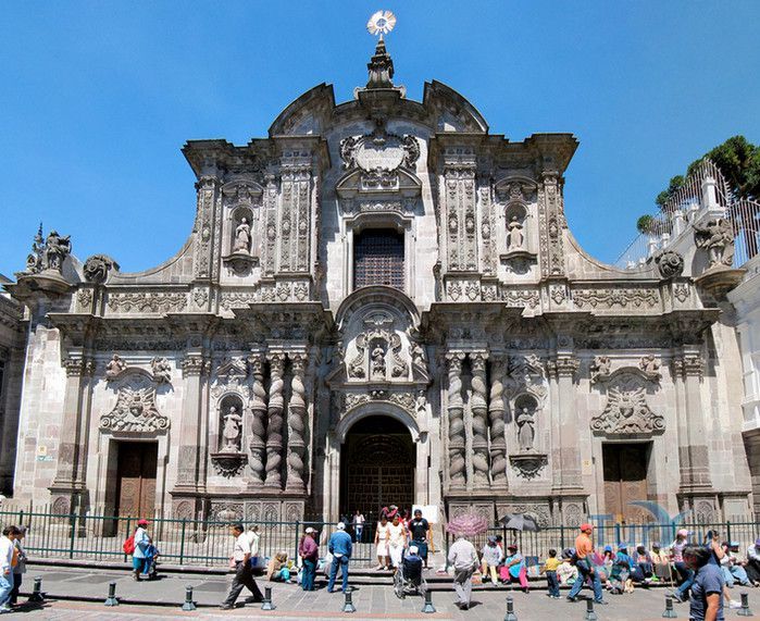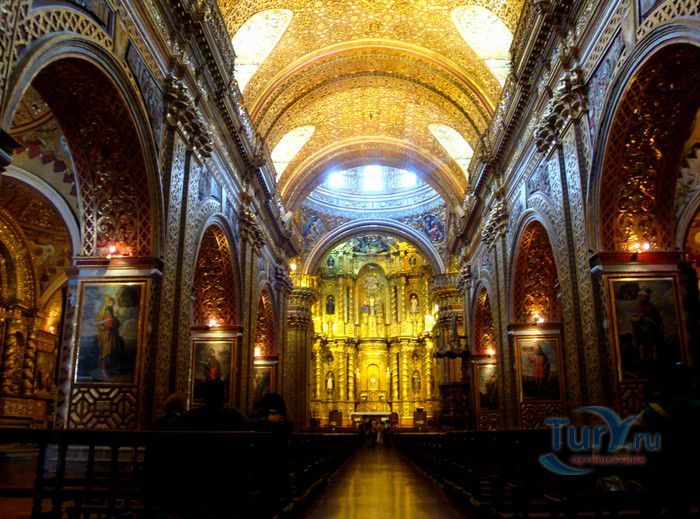 По пятам за военным покорением царства инков шло его религиозное порабощение. Католическая церковь сокрушала древние верования инков и силой обращала их в христианство. Это миссионерство осуществлялось различными церковными орденами - францисканцами, доминиканцами, августинцами и не в последнюю очередь иезуитами. Первые церкви размещались в простых, незатейливых зданиях, а для больших общин богослужение проводилось прямо под открытым небом. Но с середины XVI века строительство церквей приобретает солидный размах, индейцы под надзором священников возводят все более величественные храмы. Церкви строились, как правило, в испанском стиле - эти массивные здания с мощными стенами выглядят как неприступные бастионы веры, долженствующие уберечь хранящиеся в них святыни от осквернения индейцами-язычниками. Примерно в те же времена началась беспощадная эксплуатация месторождений золота и серебра (в 1545 году в Боливии была открыта гора Потоси, вся пронизанная серебряными жилами), и церкви во славу Божию стали все более пышно украшаться этими металлами. Построенная в стиле барокко церковь Ла Компания (La Campania - Церковь Христова братства) считается богатейшим христианским храмом всей Латинской Америки. Возведение её было начато в 1605 году, но завершено лишь в XVIII столетии. Пышный фасад, увенчанный зелеными и золотыми куполами, украшен статуями и витыми колоннами. Интерьер церкви выдержан в пурпурных и золотых тонах. Утверждают, что на убранство алтарей, стен и хоров ушло 6,4 тонны золота. Главный алтарь, расположенный под очень красивым купольным сводом, а также десять алтарей в боковых нишах щедро украшены листовым золотом. Кафедра и исповедальни поражают изысканной резьбой по дереву. Каждый свободный сантиметр стен и потолка расписан яркими, сияющими красками. Оформление интерьера иногда напоминает образцы мавританского стиля. В целом церковь производит впечатление галереи художественной школы Кито, которая и по сей день вызывает восхищение. Росписи сводов церкви Ла Компания по праву считаются ответом художественной школы Кито на знаменитую Сикстинскую капеллу. Богоматерь Скорбящая, главная икона церкви, богато украшенная золотом и изумрудами, постоянно хранится в сейфе Центрального банка и демонстрируется миру лишь по случаю особо важных церковных церемоний. В церкви покоятся бренные останки Санта-Марианиты де Хесус, святой-покровительницы города Кито. Она была родом из испанской семьи, но принимала близко к сердцу беды и страдания индейского населения, подчинив свою жизнь религиозному подвигу сурового жертвенного покаяния. Когда в городе разразилась эпидемия чумы, она предложила Господу принять её жизнь во искупление грехов других людей, и вскоре, в 1645 году, действительно умерла. В 1950 году она причислена к лику святых. Францисканцы построили в Кито множество храмов и монастырей. Благодаря им город считается столицей католической веры во всей Латинской Америке.