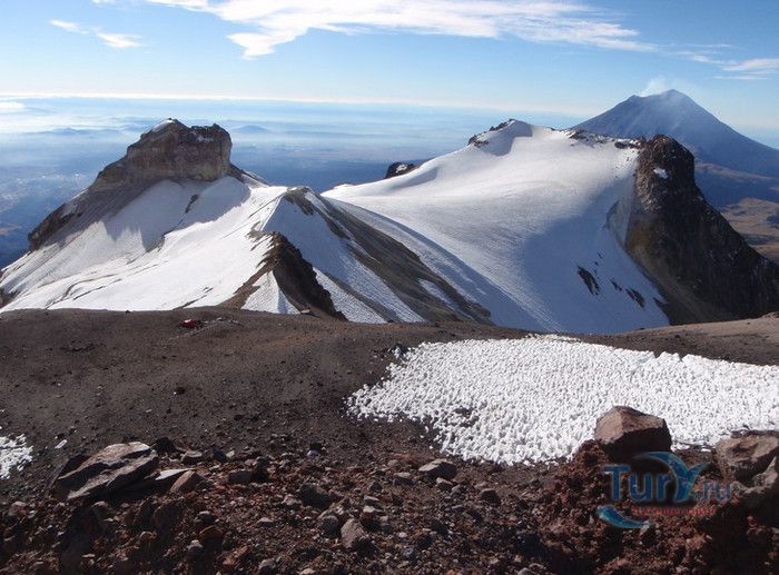 Спящий вулкан Истаксиуатль - третья по высоте горная вершина Мексики, в переводе с индейского языка науатль её название означает "Белая женщина", чаще гору зовут просто Иста. Вулкан расположен на Центральном нагорье, между хребтами Кордильер Сьерра-Невада и Сьерра-Мадре, в 70 км на юго-восток от города Мехико, на территории Национального парка Иста-Попо. У горы Истаксиуатль четыре пика, наивысшая вершина Печо имеет высоту 5230 метров над уровнем моря. С западной и восточной сторон вулкана силуэты четырёх снежных пиков напоминают голову, грудь, колени и ступни спящей женщины. Первое восхождение на вершину Исты было совершено в 1889 году. Следующими экспедициями были обнаружены доказательства того, что на вулкан в древние времена поднимались ацтеки и представители более ранних цивилизаций. Гора Истаксиуатль и соседний вулкан Попокатепетль (Попо) у древних жителей Мексики считались священными, с ними связаны множество легенд и преданий. Одна из них, самая романтическая, о любви Исты, дочери вождя ацтеков, и простого воина Попо. Влюблённые решили заключить брак, но коварный отец Исты не желал иметь в зятьях бедного и незнатного юношу. Вождь отослал Попо на войну, чтобы тот своей доблестью доказал право обладать царской дочерью. Однако, это был только предлог, чтобы разлучить влюблённых. Девушке принесли ложную весть о смерти её возлюбленного. От горя сердце Исты остановилось. Вернувшийся с поля боя Попо взял на руки бездыханное тело невесты и отправился в горы, чтобы там оплакать свою утрату. От страданий по любимой и его сердце перестало биться. Растроганные боги подарили влюблённым вечную жизнь и превратили их в горы-вулканы, стоящие рядом. Иста мирно спит, укрытая снежным покрывалом, а Попо до сих пор гневается, периодически извергая дым, лаву и пепел. Вершина вулкана Истаксиуатль манит альпинистов - профессионалов и любителей. С его вершины открывается потрясающий вид на вулкан Попокатепетль и долину у подножия горы.